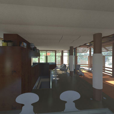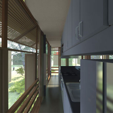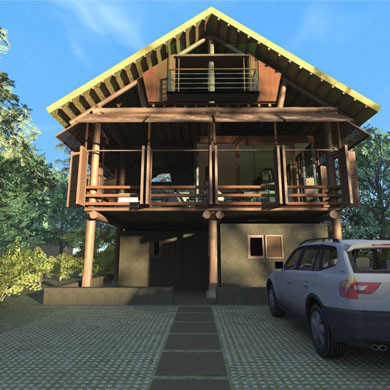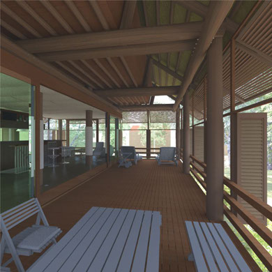 Log structure typical of local utilitarian buildings; panelized and modular units in the upper (living room) story infill and ground floor bathrooms; masonry and textiles on the ground floor main rooms.